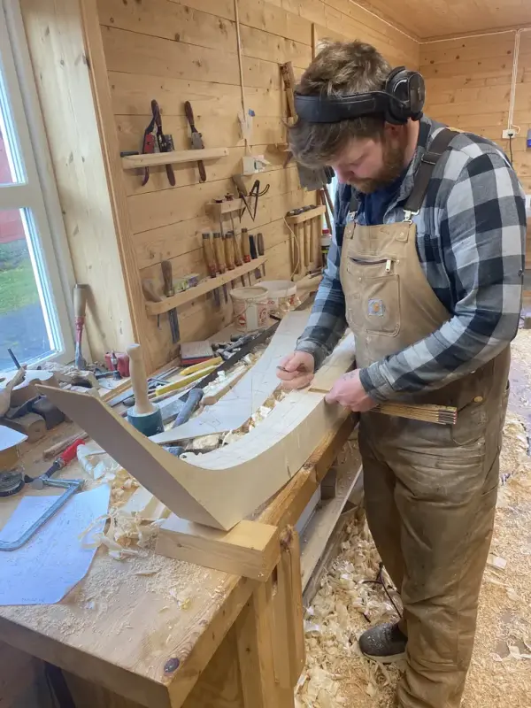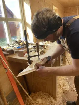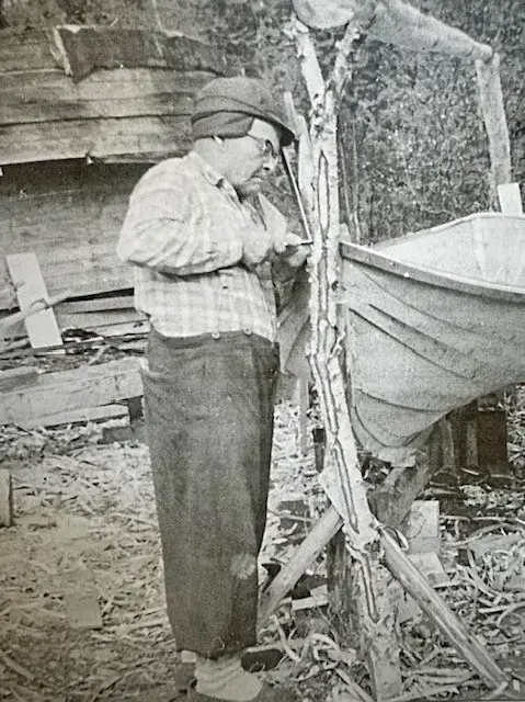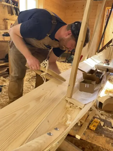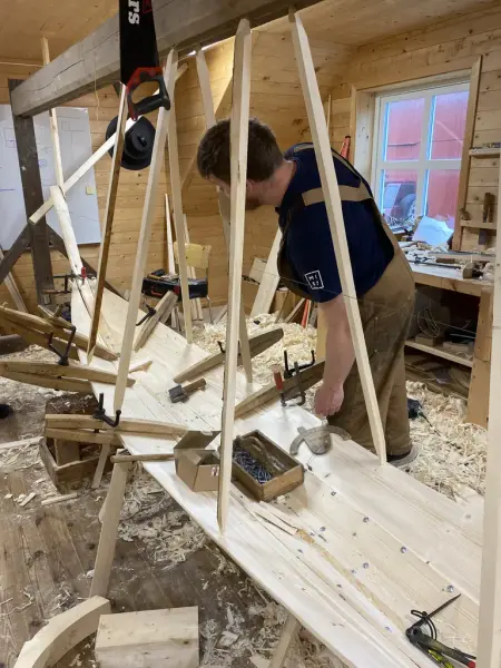 Originalbåten var bygd av båtbygger Jonas Mikael Marsfjell fra Røyrvik, en to-roms spissbåt bygd i gran. Den står i magasin på Saemien Sijte. På et foto av båtbygger Marsfjell står han ute og bygger med skorstokk. Dette gjorde at båtbyggernes erfaring med skoreteknikk i åfjordsbåtbygging, kunne brukes på bygging av den sørsamiske båten (foto: Saemien Sijte).