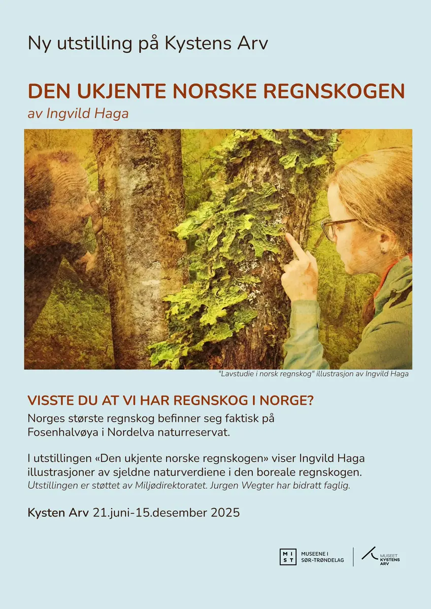 Utstillingen formidler sjeldne naturverdier i norsk regnskog, en skogtype mange ikke er klar over at vi har. I Trøndelag, Nordland og på Vestlandet finner vi biter av den gjenværende norske regnskogen. Mye av artsrikdommen befinner seg på mikronivå. Gjennom vakre illustrasjoner synliggjør Ingvild Haga naturverdier folk flest ikke ser eller har lite kunnskap om. Sammen med bildene formidles informasjon om norsk regnskog og viktigheten av vern av disse truede naturverdiene. Utstillingen er et tverrfaglig prosjekt hvor kunst og naturformidling smelter sammen. Jurgen Wegter har bidratt faglig. Prosjektet er støttet av Miljødirektoratet og ble første gang utstilt ved Norsk skogmuseum i 2021.