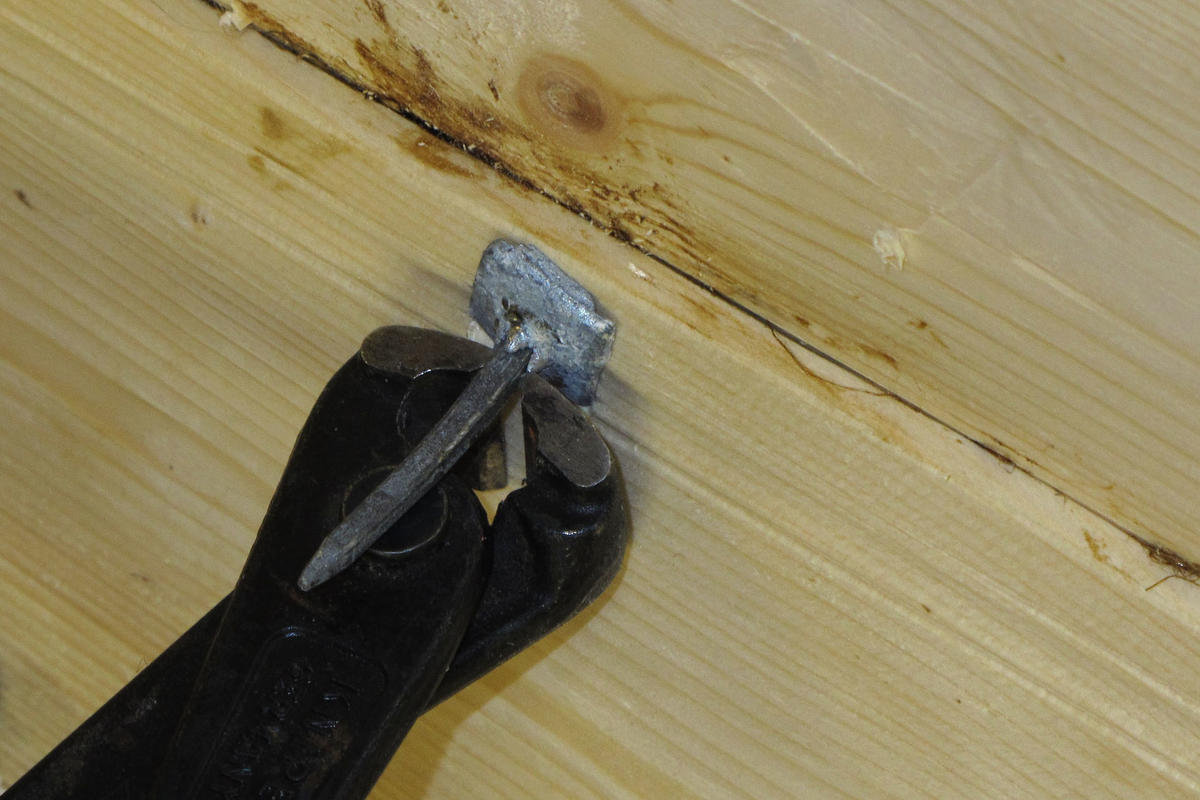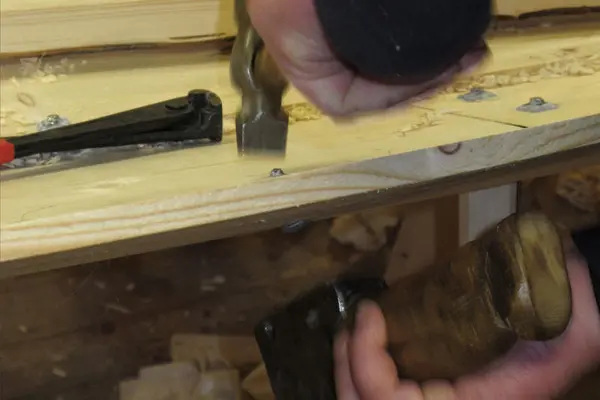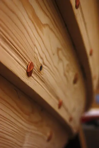 Bandene festes til bordene ved hjelp av trenagler som kiles fast. Trenaglene er litt føyelige, og det gjør at veden ikke sprekker opp selv om båten bøyer seg i sjøen.