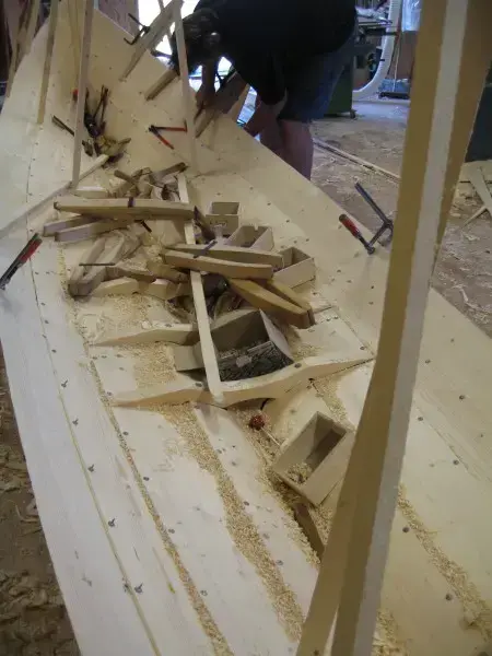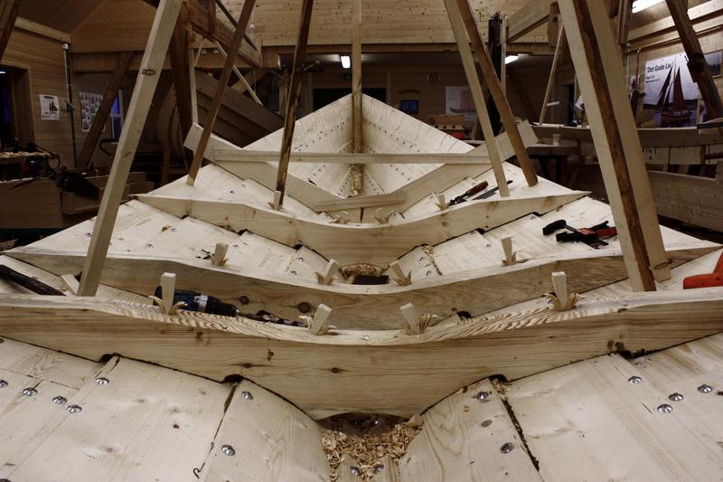Først settes reiset opp: kjøl, lott og stevner. Så settes halsene på. Halsene er hogd i fasong, så de er vinde og uthult. Det gir godt innløp og løft, så båten glir lettere gjennom vannet.